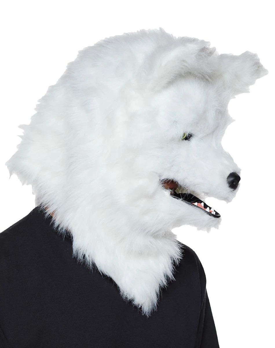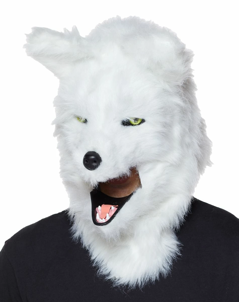 Stop your hunt, the White Wolf Moving Mouth Mask is all you need for a realistic animal inspired look. This white faux fur wolf head features striking yellow-green eyes that stare right into your victim’s soul. The movable mouth allows you to talk that sly wolf talk, just sit your chin in and you’ll be enticing Grandma to come into your lair.