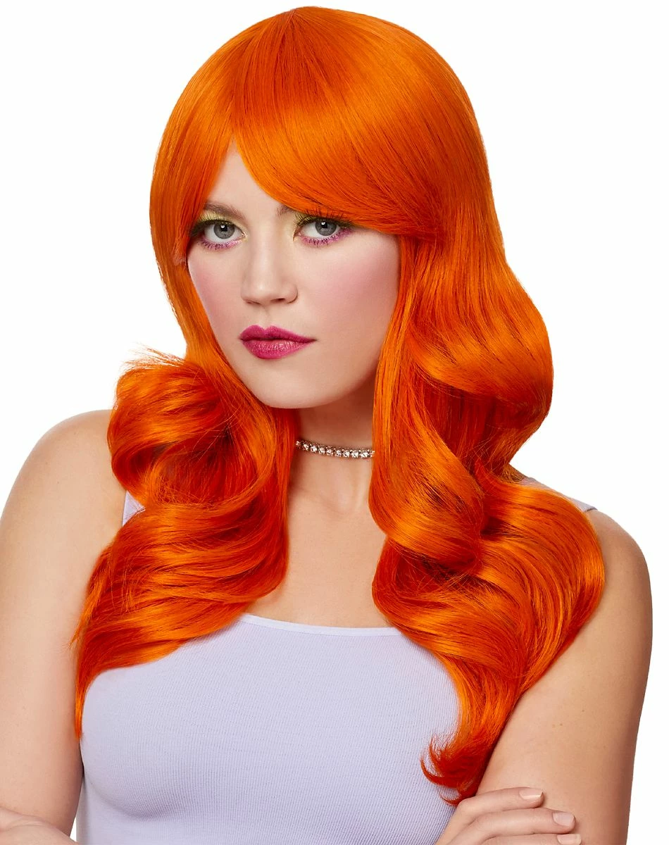 Let this orange wig complete your look! The gorgeous color and amazing curls are sure to have you looking and feeling great all day and night.
