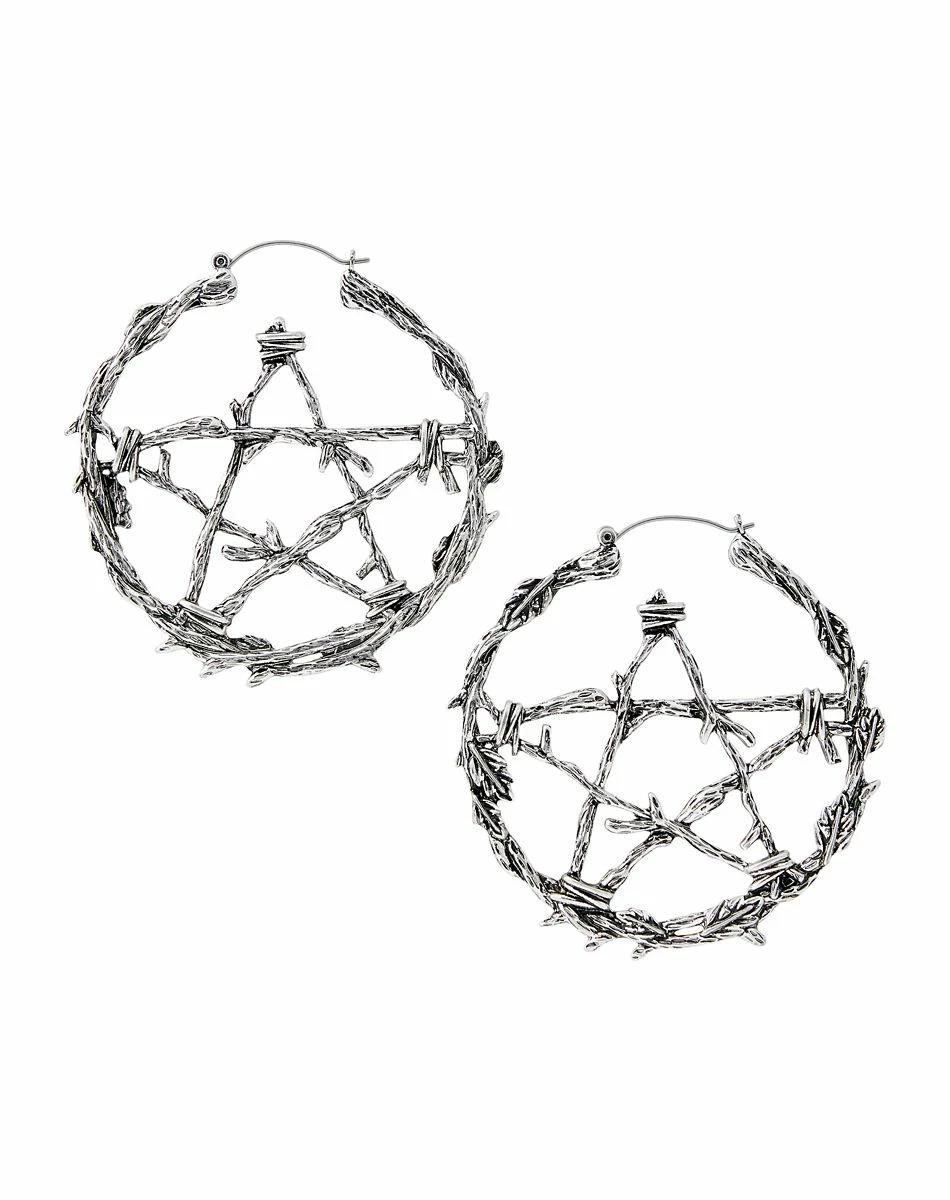 Give your witch look a frighteningly fashionable boost with these pentagram hoop earrings! These intricately molded earrings feature stick and leaf patterns that have been carefully crafted into pentagrams. A hinged hoop closure keeps these head-turning earrings safely in place all night long.