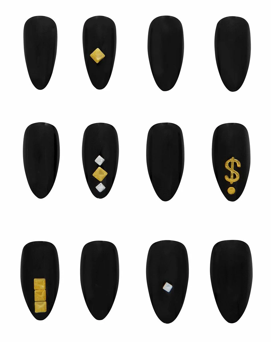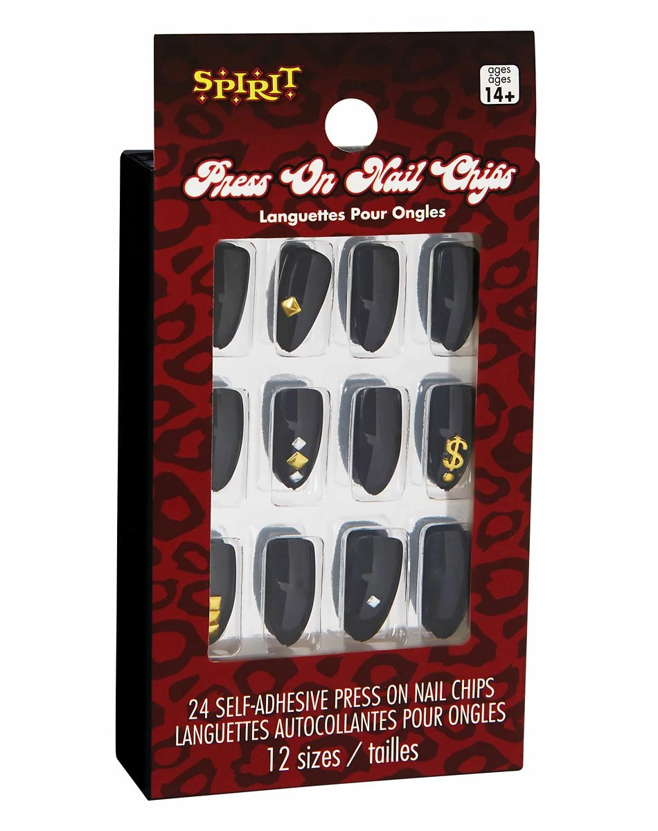 Make your pimp costume come to life with these black studded press on nails. These exciting Halloween nail designs feature a dollar sign and diamond shaped studs to show everything you’re in the money.