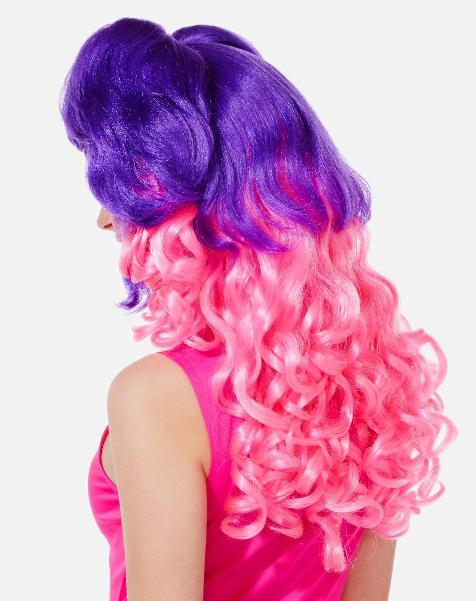 Go all out with this awesome and intensely colored wig! This wig is a vivid purple at the top with a pretty bright pink at the bottom, and also includes two clip on ponytails to make the wig even more wild and fun!