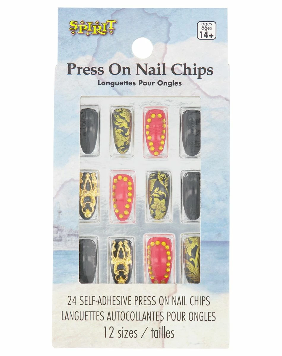 Complete your pirate look with these beautiful press-on nails. The black, red, and gold designs are sure to have you standing out.