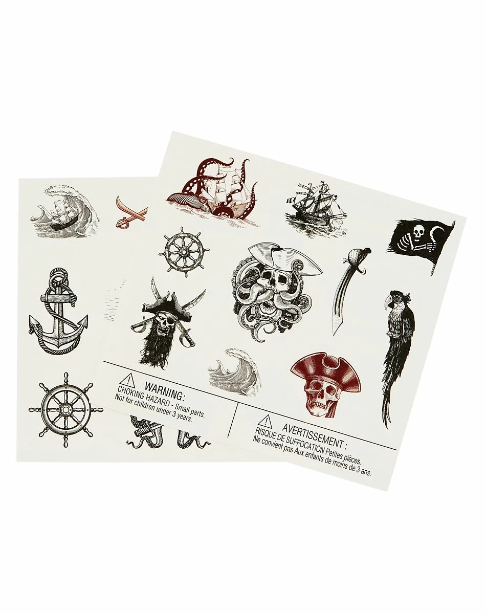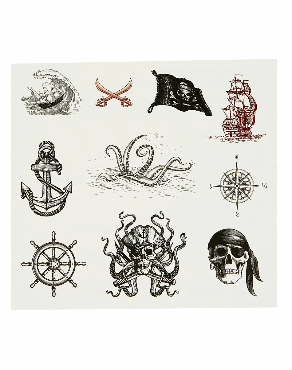 Ahoy, matey! Complete your pirate look with these Pirate Temporary Tattoos! Featuring anchors, waves, and pirate skulls, this temporary tattoo set has everything you need to look like a seasoned pirate. Apply these temporary tattoos to clean, dry skin with a damp cloth for a seaworthy style.