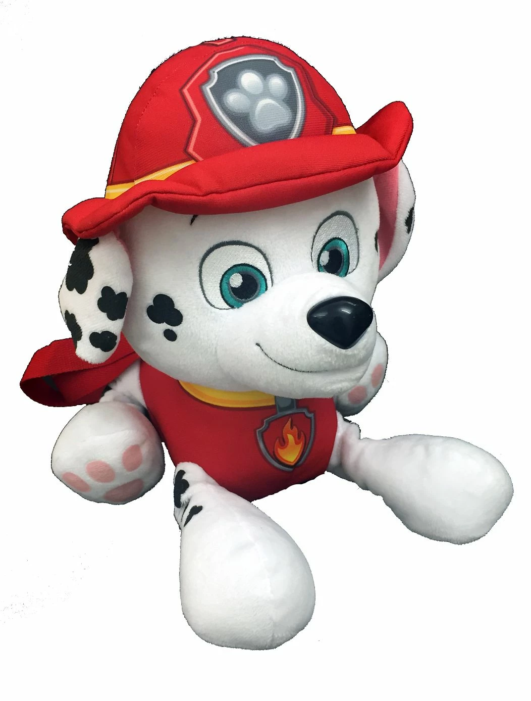 Ruff ruff rescue! Join the PAW Patrol in style while carrying your things in this officially licensed Marshall plush backpack! Marshall the dalmatian fire pup is ready to take down fires as your plush backpack with his fire hat and matching shirt attached to red straps.