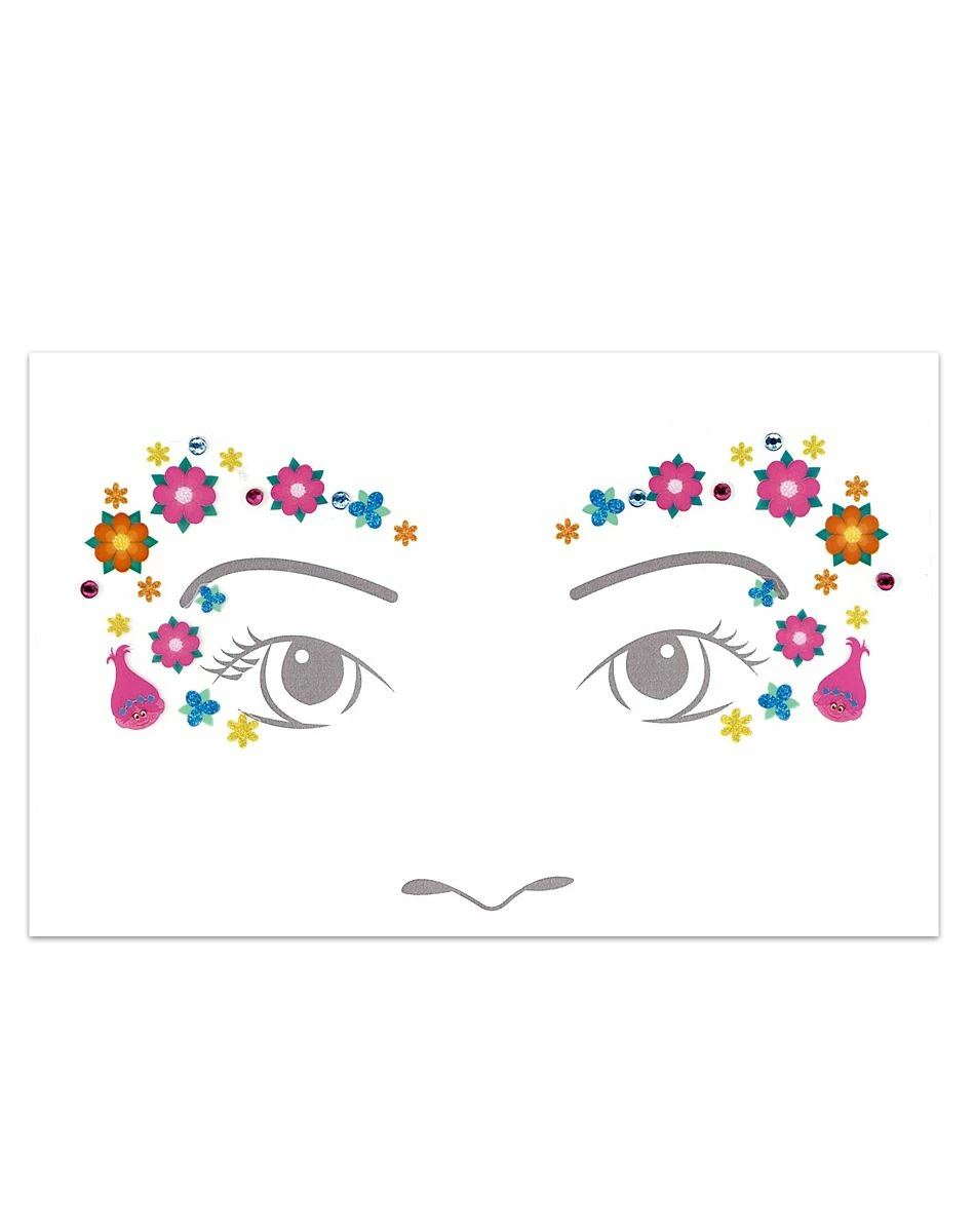 Get ready to sing, dance, and hug as Poppy the Troll with these colorful face decals! Featuring bright pink, yellow, and blue flowers, these decals will make you look just like everyone’s favorite happy Troll!
