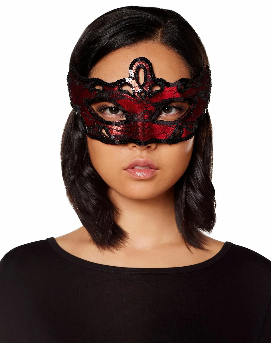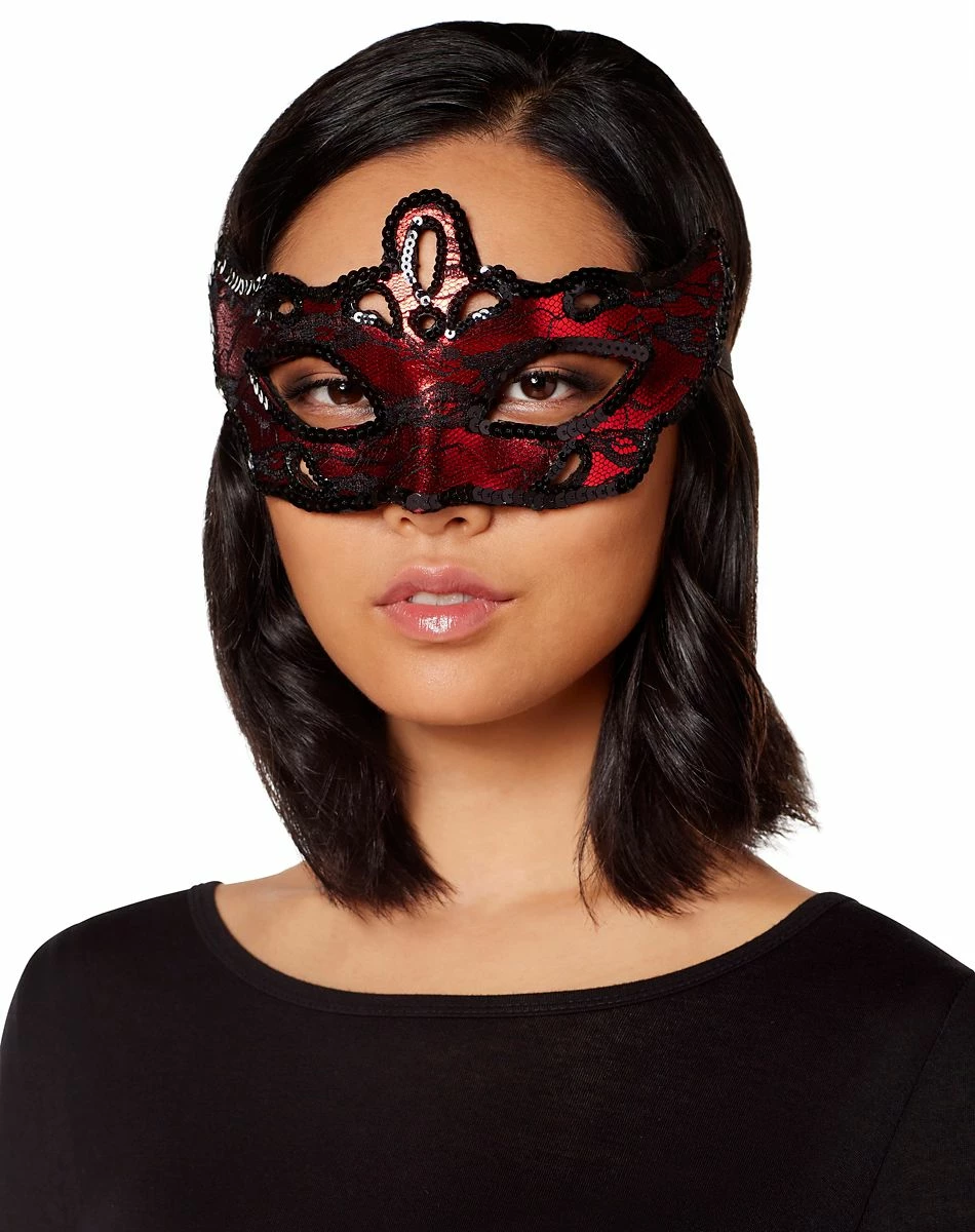 You’ll be the most mysterious beauty at the party in this stunning red and black eye half mask. Adorned with shiny black sequins and delicate lace, this mask is the perfect romantic accessory.