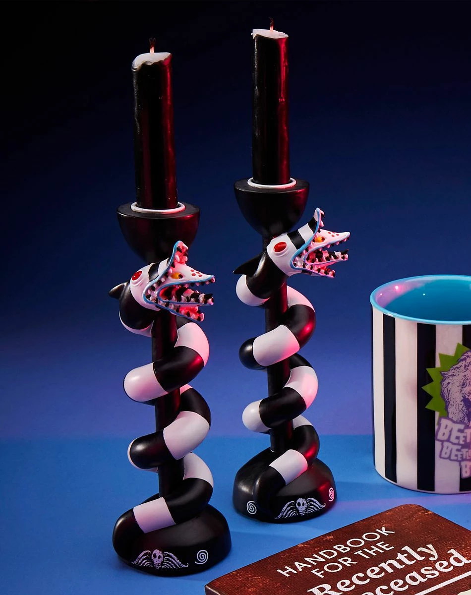 Light up any room this Halloween while showing your love for Beetlejuice with this Sandworm Candle Holder. This black and white striped candle holder is great for setting the Halloween mood around the home and will be a terrific addition to your seasonal décor.