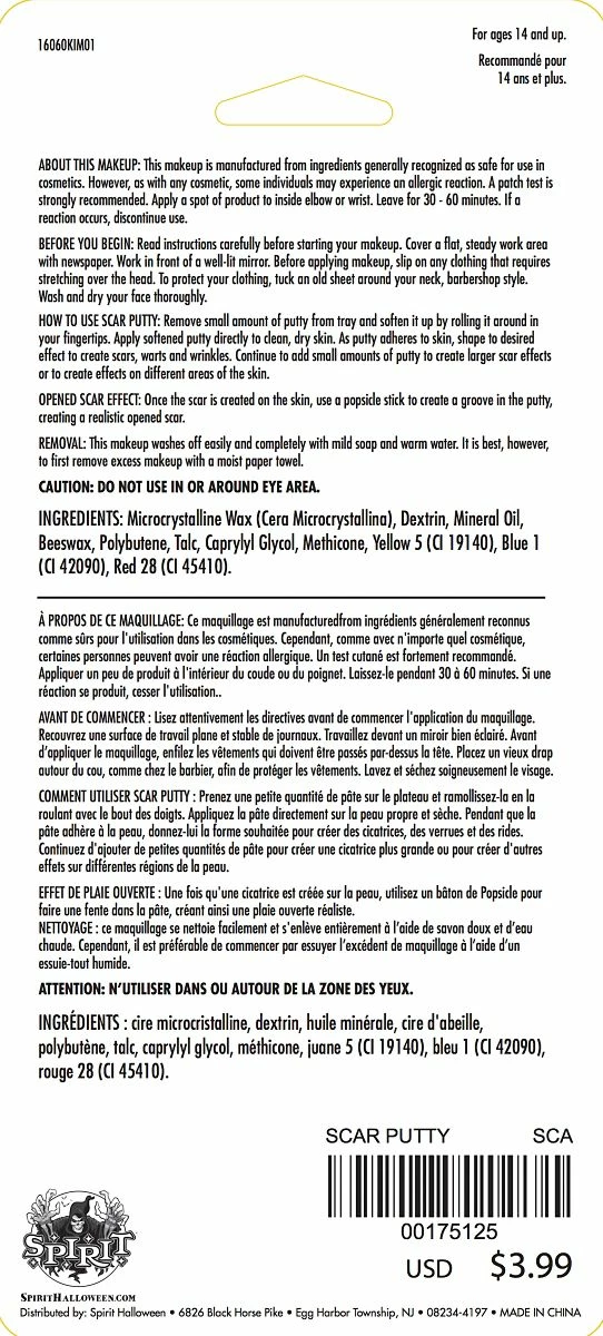 Theatrical quality scar putty lets you create a unique look. Gangster, monster, ghoul, contender or tough guy – you decide!