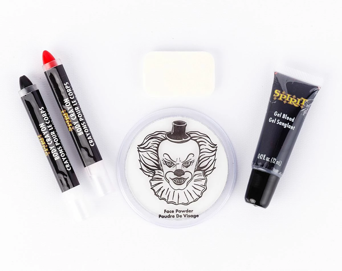 Welcome to the twisted circus! This scary clown makeup kit is the perfect way to make your scary clown costume even more terrifying! With two body crayons, white face powder, fake blood and a sponge, you’ll be able to get the look you’ve been dreaming of.
