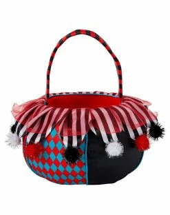Make trick-or-treating even more fun when you carry this colorful Scary Clown Treat Bucket! This bucket features black and white stripes and red and teal diamond patterns along with tinsel-covered pom poms and red-and-black striped handle. Carry all your candy in style with this bucket.