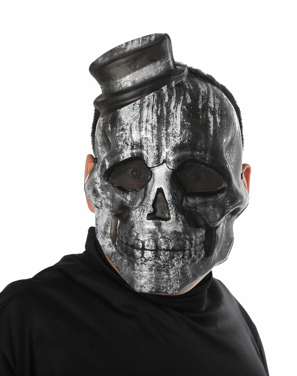 This Halloween roam the streets as Skele-Boy with this Skele-boy mask. This mask features a matte black and gray skull design along with a tiny top hat to give it its own unique style. Need a last minute costume? This mask is a perfect choice for anyone who is looking for something spooky but not too serious. A great addition to any costume, this skele-boy mask is one of a kind!