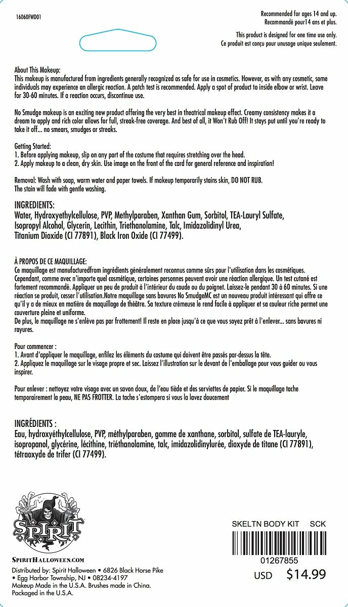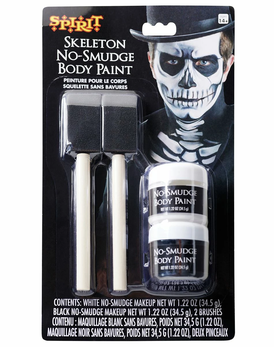 Get ready to truly transform this Halloween with this Skeleton Body Paint Kit! The skeleton kit includes both white and black no-smudge paint and application brushes for the perfect deadly look.