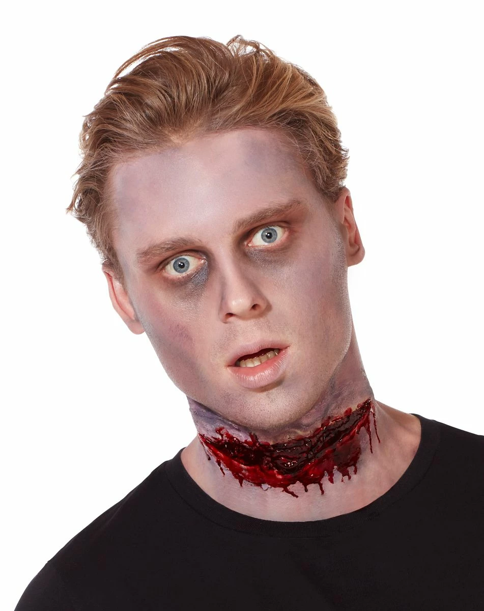 Watch everyone gag when they catch sight of you after having applied this Slashed Neck Effects Kit. Why? You’ll look as if a serial killer paid your neck a very personal visit with his metal claws last night. The realistic-looking latex prosthetic attaches easily with Spirit Gum Adhesive (sold separately) to instantaneously transform you into the latest victim from a gruesome slasher. Perfect your knife wound with blending makeup and fake blood (both sold separately).