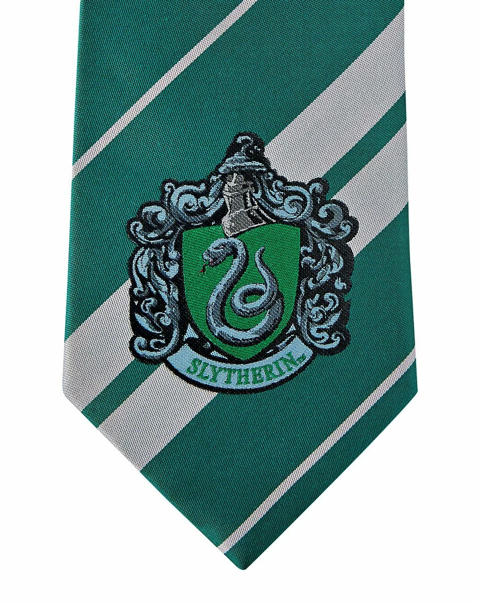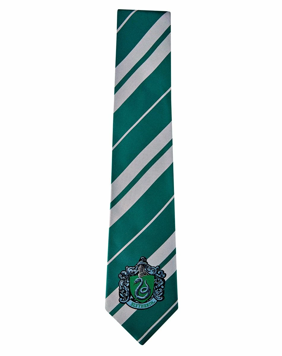 Look like a pure-blood at Hogwarts when you wear this officially licensed Slytherin Tie! The green and white striped tie features the Slytherin snake crest on the front. Perfect accessory to represent the house you belong to!