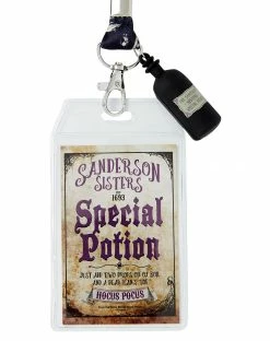 Carry your keys and ID easily in this official Special Potion Hocus Pocus lanyard! Show off your favorite movie with this fun lanyard that has a small potion charm and reads “Sanderson Sisters, est. 1693, Special Potion, just add two drops oil of boil and a dead man’s toe.” It’s perfect for any Hocus Pocus fan! The double-sided strap reads “It’s just a bunch of Hocus Pocus” in white on purple on one side and features skulls on the other side.