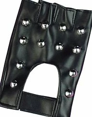 - Item is a pair of black vinyl fingerless gloves with silvertone metal studs.
