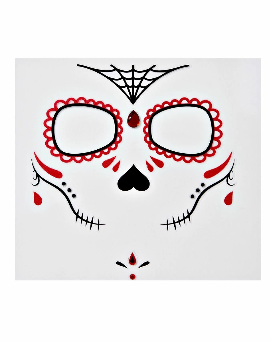 Complete your Day of the Dead costume with the Officially Licensed Sugar Skull Face Decal. Features red and black decals that form the face of a traditional sugar skull.