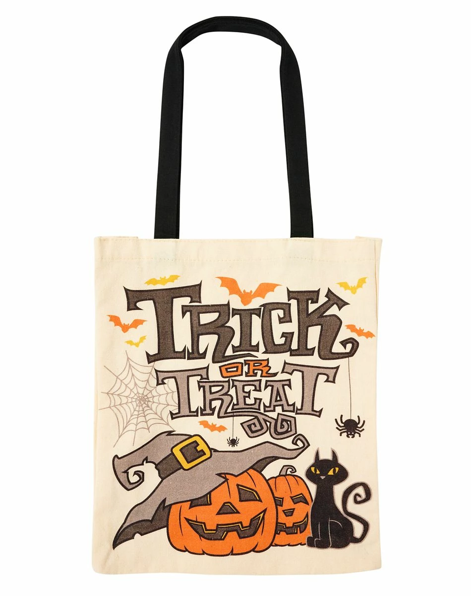 Get ready to fill this Trick or Treat Canvas Tote with candy on Halloween night! The canvas tote features candy corn graphics in the background and “Trick or Treat” in black in the middle.