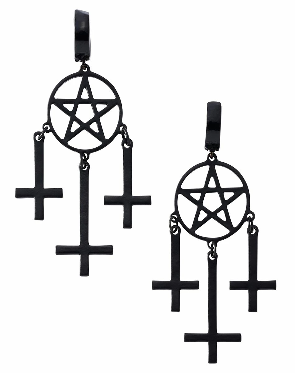 Complete your Halloween look with these unholy earrings! These black dangle earrings feature a pentagram and upside down crosses to let everyone know just how unholy you are.