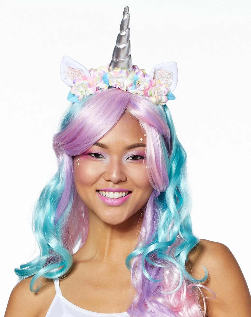 Add a pop of color to your unicorn costume with this vibrant flowery headband! Featuring pink, yellow, purple, and blue petals, white glittery ears, and a shining, silver unicorn horn, this headband will perfectly complete any colorful ensemble.