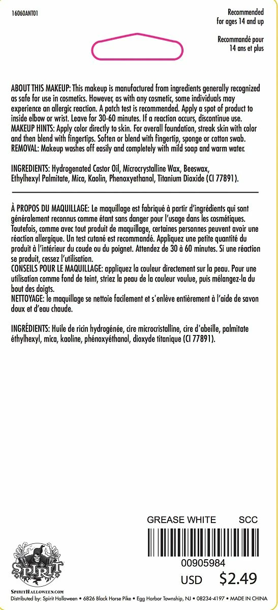 This Spirit Exclusive White Grease Makeup can make a clown out of anyone this Halloween! The 1 oz. tube is perfect for vampires, clowns, mummys, ice effects or any other ghostly blended look you can think of. It’s easy to apply, easy to wash off and looks great!