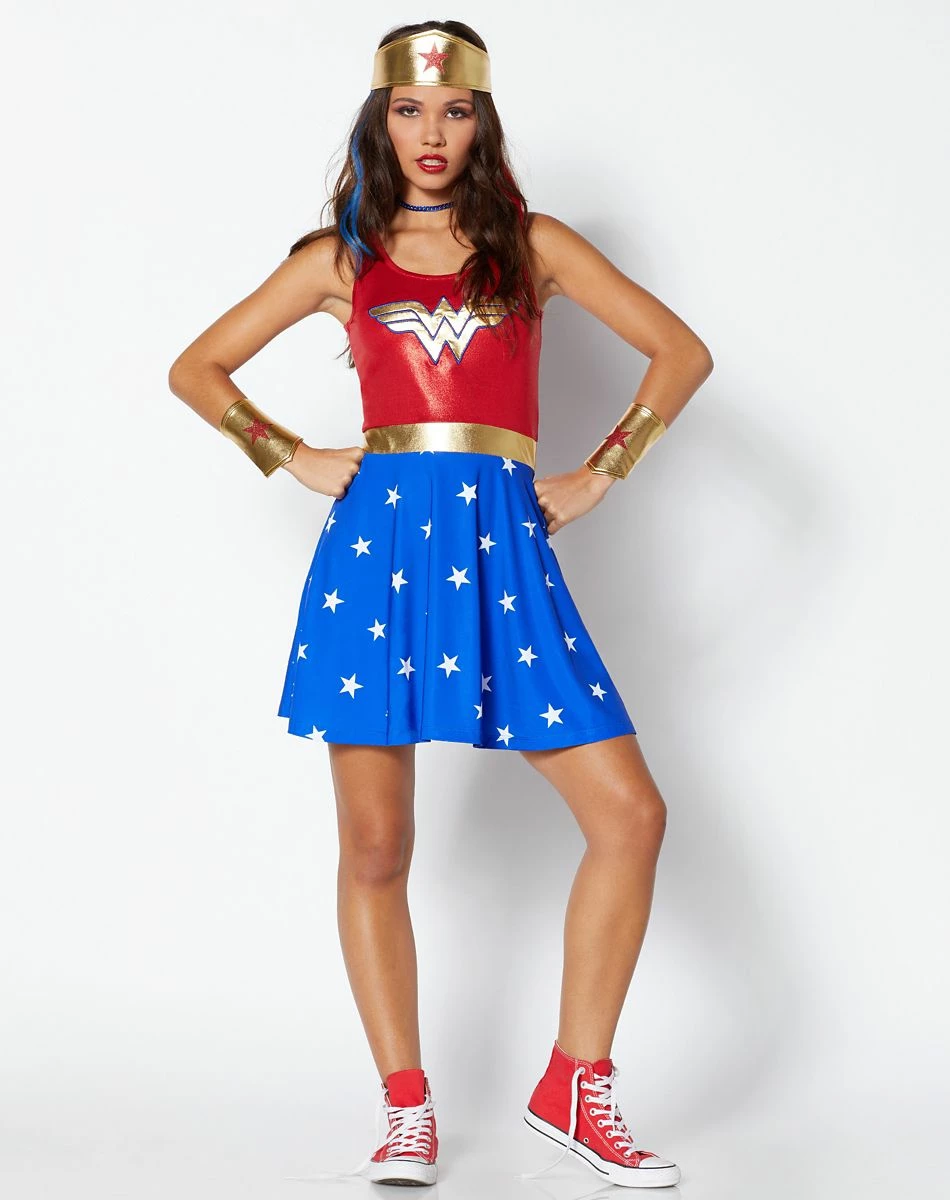 Save the world as one of the founding members of the Justice League with this heroic Wonder Woman dress kit! Featuring Wonder Woman’s red and blue star-studded dress, plus a matching headpiece and gold armbands, this ensemble has everything you need to save the world. Soar your way into Halloween with this iconic costume!